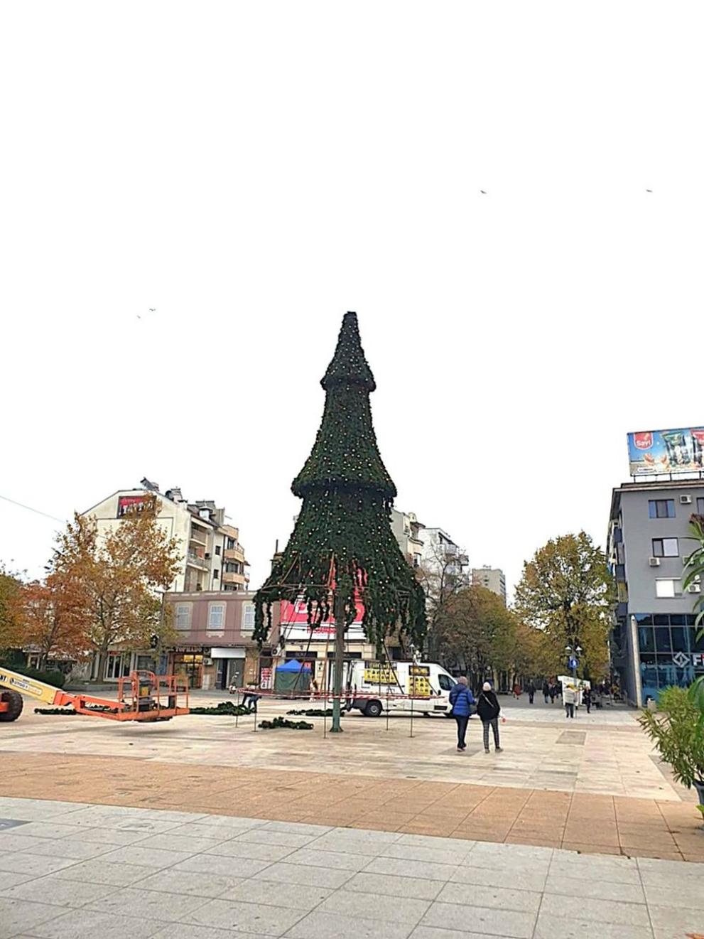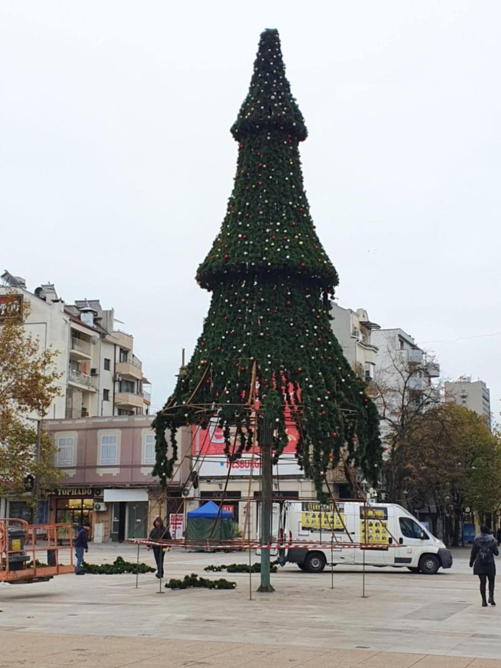Коледната елха на площад „ Тройката “ в ече гордо издига снага и ще радва бургазлии и гостите на града с рекордните 9000 светещи лампички и 1000 празнични топки .