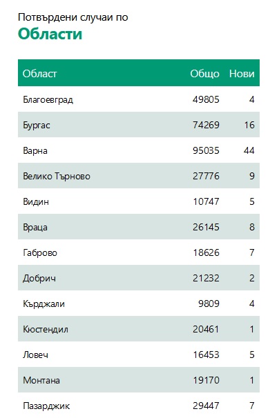 Областта първенец е Смолян – без нито един нов случай. В Кюстендил и Монтана пък има единствено по един новозаразен.