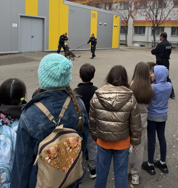 С голяма наслада полицейски чиновници от Второ районно управление (на МВР) и техни сътрудници от група „ Водачи на служебни кучета “ към бранш „ Специализирани полицейски сили “ откликнаха на поканата на управлението на ОУ „ Екзарх Антим I “ да запознаят учениците от 2.клас със своята специалност.