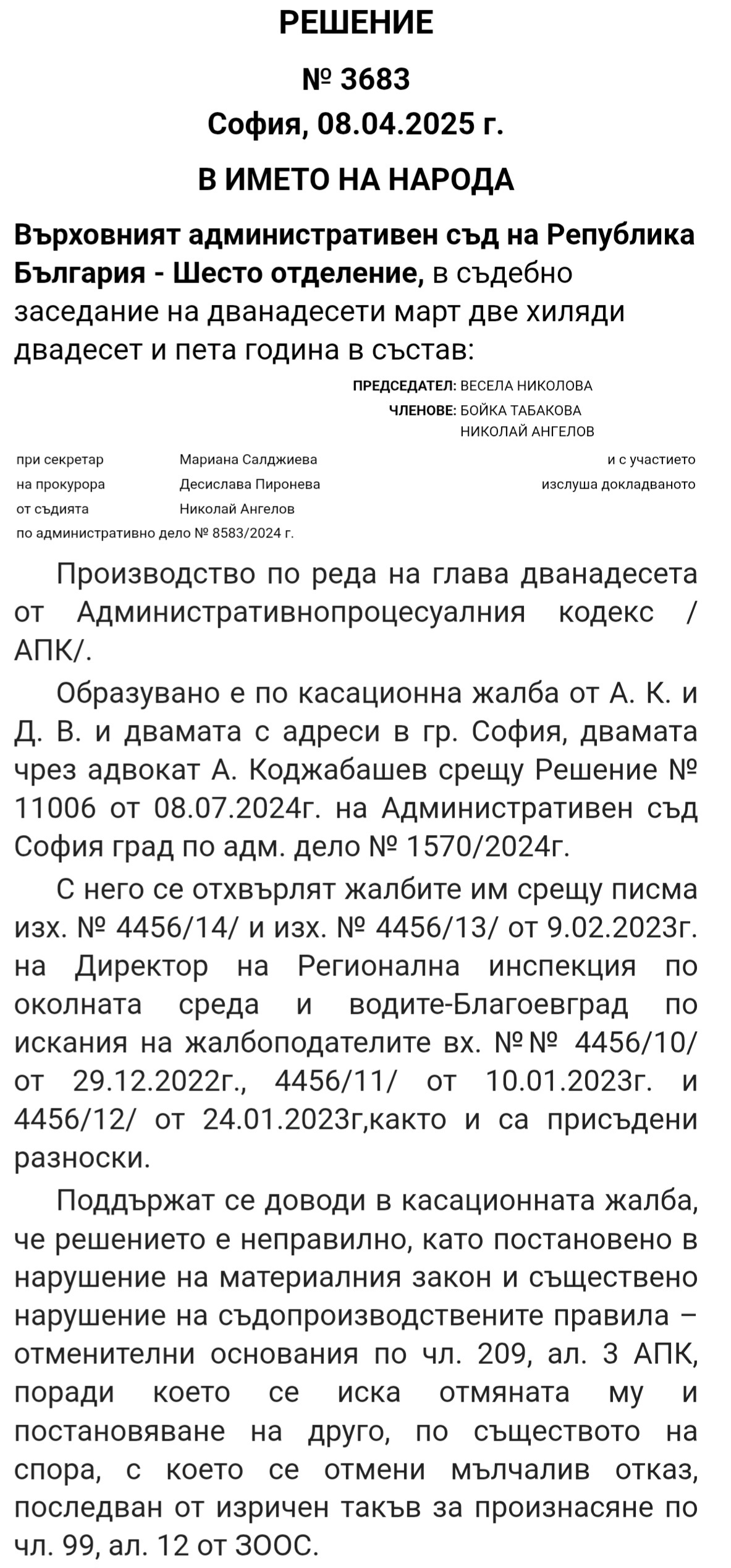 И двете инстанции – Административен съд Благоевград и Върховният административен съд – отхвърлят жалбите на „ зелените “. Мотивите на Върховен административен съд са, че в законоустановения период на годност на решението по Оценка на въздействието върху околната среда са подхванати дейности по реализация на капиталовото предложение за дотъкмяване на Автомагистрала „ Струма “ – дейности, които по всякакъв начин бяха блокирани от „ зелените “ Неправителствени организации.