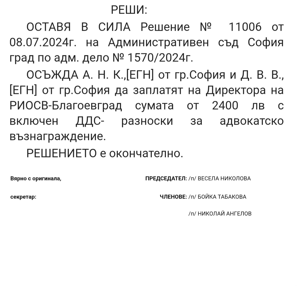 И двете инстанции – Административен съд Благоевград и Върховният административен съд – отхвърлят жалбите на „ зелените “. Мотивите на Върховен административен съд са, че в законоустановения период на годност на решението по Оценка на въздействието върху околната среда са подхванати дейности по реализация на капиталовото предложение за дотъкмяване на Автомагистрала „ Струма “ – дейности, които по всякакъв начин бяха блокирани от „ зелените “ Неправителствени организации.
