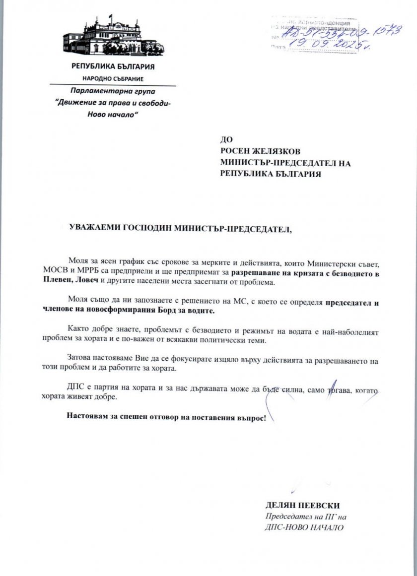 С остро писмо се обърна към премиера Росен Желязков водачът на Движение за права и свободи и ПГ на ДПС-Ново начало Делян Пеевски. В него той упорства за незабавни ограничения от държавното управление за дейности по отношение на разрешаването на казуса с безводието, който обгръща от ден на ден общини и обитаеми места.
