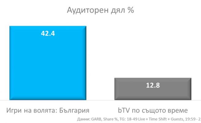Пилотният епизод на „ Игри на волята: България “ съумява бързо да притегли феновете и внезапно усилва аудиторията си. В края на епизода, данните регистрират забележителна преднина за NOVA – над половината от всички телевизионни фенове към този момент гледат „ Игри на волята: България “, до момента в който резултатите за втората телевизия демонстрират едвам 7% аудиторен дял.