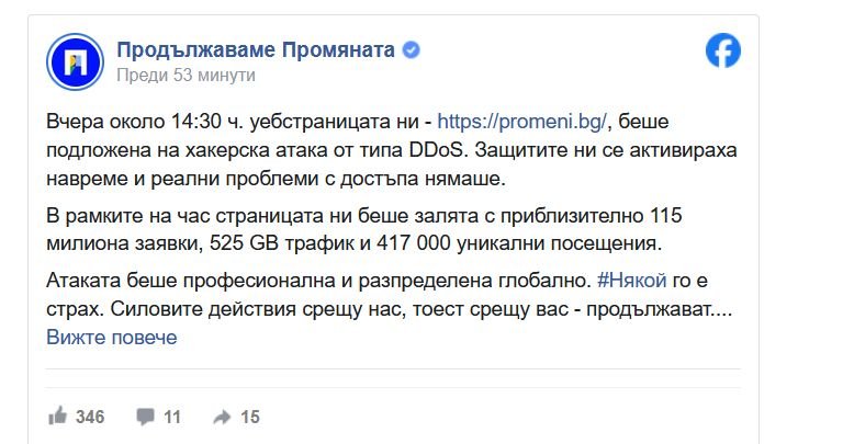 С пост в обществената мрежа от " Продължаваме промяната " показват, че през вчерашния ден към 14:30 ч. уебстраницата - https://promeni.bg/ е била подложена на хакерска офанзива от вида DDoS.