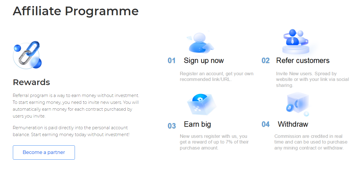 AMGCrypto ви разрешава да печелите безвъзмезден Биткойн посредством рекомендации и всякога, когато ваш другар купи контракт за рандеман в облака благодарение на AMGCrypto, можете да спечелите до 7% комисиона върху сумата на неговата поръчка. Когато препратите избран брой дейни хора, е допустимо да получите закрепен бонус в размер до $3,000. Освен това е значимо да се означи, че има и бонус от $12 за първа регистрация в AMGCrypto.