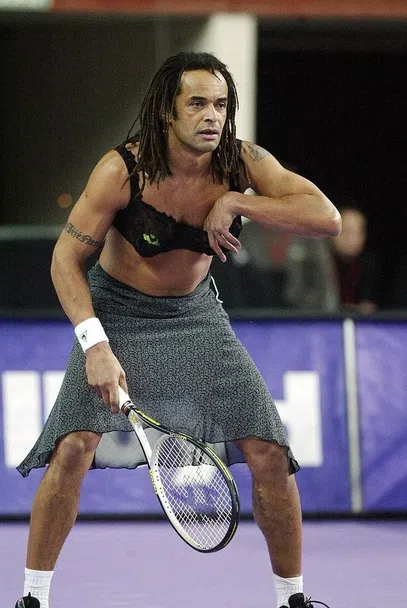 През 2003 година Яник Ноа, облечен в рокля и без да приема дуела изцяло съществено, побеждава младата Жюстин Енен в трисетов показателен мач, изпълнен с ексцентрични удари и слайсове - 4:6, 6:4, 7:6.