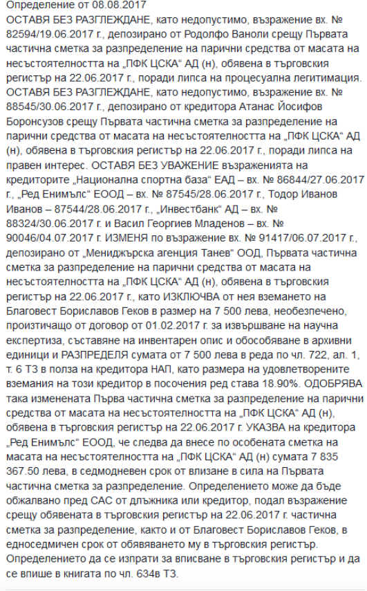 УКАЗВА на кредитора „ Ред Енимълс “ ЕООД, че следва да внесе по особената сметка на масата на несъстоятелността на „ ПФК ЦСКА “ АД (н) сумата 7 835 367.50 лв., в седмодневен период от влизане в действие на Първата частична сметка за систематизиране. Определението може да бъде обжалвано пред САС от длъжника или заемодател, подал несъгласие против оповестената в комерсиалния указател на 22.06.2017 година частична сметка за систематизиране, както и от Благовест Бориславов Геков, в едноседмичен период от оповестяването му в комерсиалния указател.