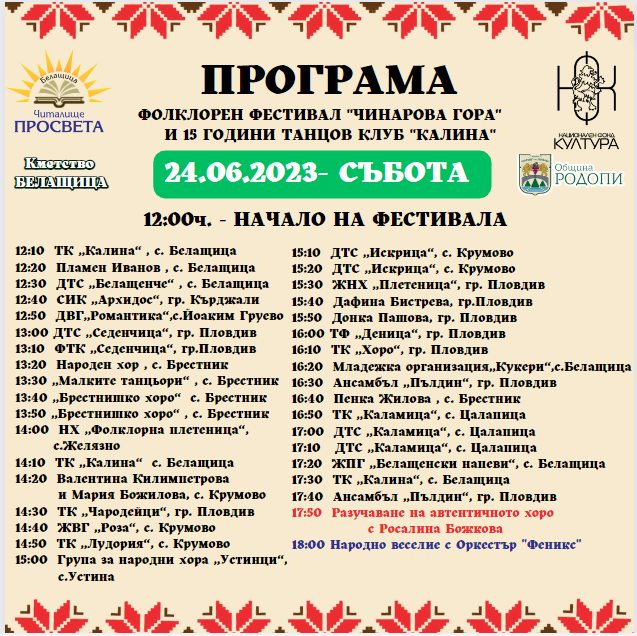 Народни песни и кръшни хора ще се извият в „ Чинаровата гора ” край село Белащица. Във фолклорния фестивал ще се включат самодейци от читалищни сформира от Пловдив, Кърджали, Йоаким Груево, село Желязно, както и групи от обитаемоте места в община „ Родопи “. На особено построената сцена ще качат и Търговска колегия „ Калина “ от село Белащица, които ще отбележат 15 години от основаването си.