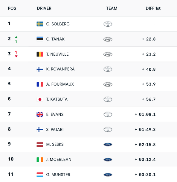 Това обаче не би трябвало да отнеме от съвършеното каране на Солберг, който не беше най-бърз единствено в последния стадий преди обедния сервиз, в който беше изпреварен от Танак с 0.5. Грешката на естонеца от сутринта обаче го вкара в двубой за второто място с неговия съотборник Тиери Нювил, като двамата разменяха своите позиции след всеки стадий. В момента разликата сред тях е 0.4 в интерес на домакина.