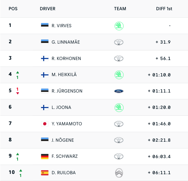 В WRC2 представителят на домакините Роберт Вирвес продължава да има удобен задатък от 31.9 пред своя съотечественик Гьорг Линамае, който пък има преднина от 24.2 пред финландеца Роопе Корхонен. Мико Хейкила и Ромет Юргенсон оформят челната петица, изоставайки със надлежно 1:10.0 и 1:11.1 от водача Вирвес.