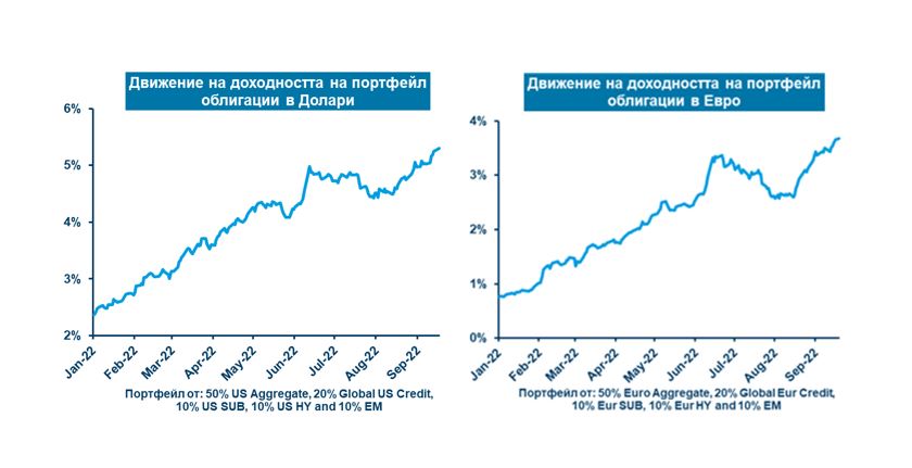 На графиките по-долу може да видите да вземем за пример по какъв начин се е повишила от началото на годината предстоящата рентабилност (yield) на добре диверсифицирани портфейли, които включват както държавни по този начин и корпоративни облигации, с цел да доближат близо +4% в евро и +5% в щатски долари: