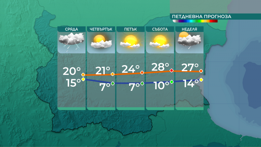 Максималните температури доста ще се намалят и ще са от 15-16° тук-там в Североизточна България до 24-25° в Горнотракийската равнина, само че и там в следобедните часове внезапно ще застудее.