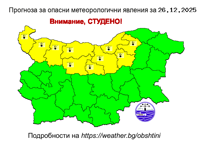 Код жълто - предизвестие за ледено време, при което температурите и денем остават под нулата, е разгласен в Северна България за 10 области, където оптималните температури ще бъдат не повече от минус 2° - минус 1°. Това са областите Видин, Монтана, Враца, Плевен, Ловеч, Габрово, Велико Търново, Русе, Разград и Търговище.