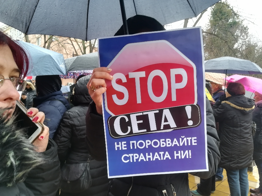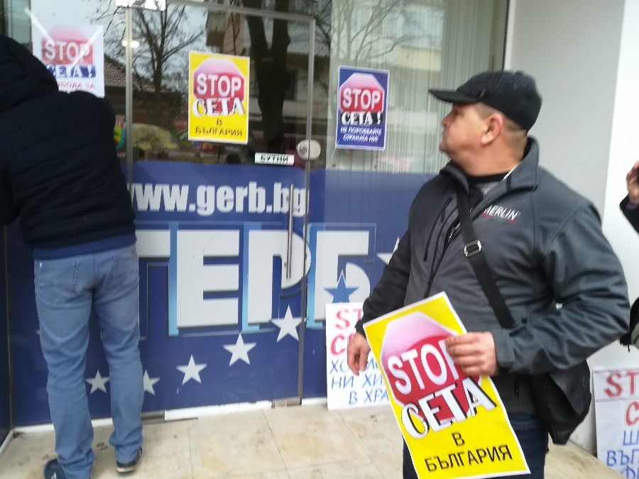 С възгласи „ Стоп СЕТА “ и „ Оставка “ поданици на Добрич стачкуваха против утвърждението на комерсиалното съглашение. Част от плакатите те залепиха на вратата на локалния офис на ГЕРБ с претекста, че с гласовете на ръководещата партия и на Движение за права и свободи утвърждението мина на първо четене в Народното събрание.
