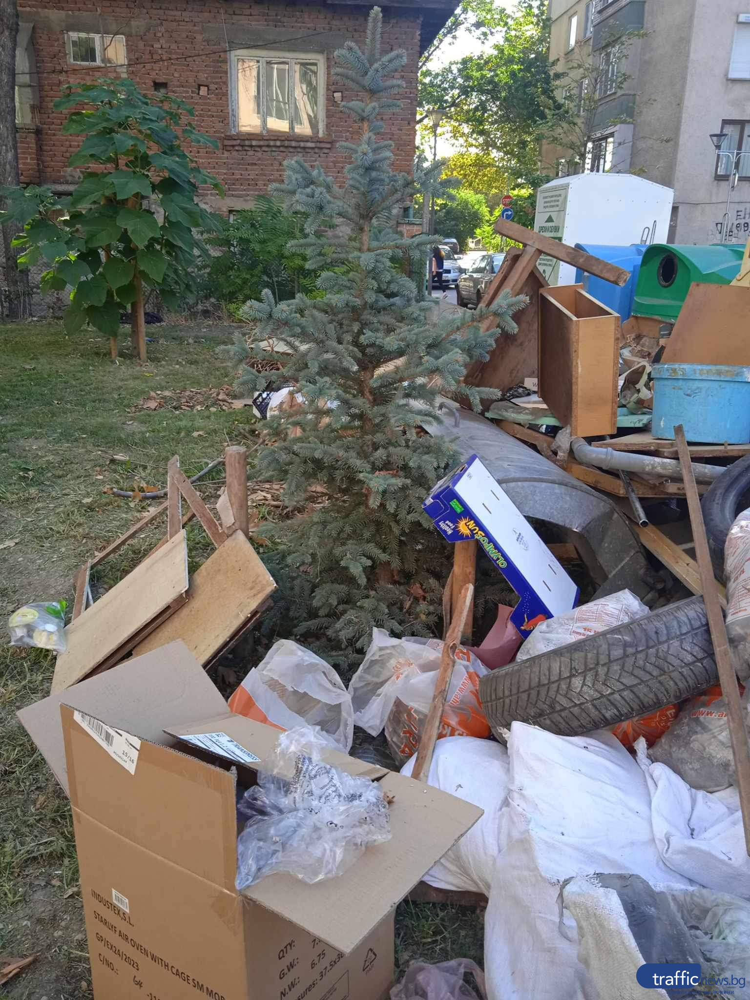 На мястото са изхвърлени строителни боклуци, остарели едрогабаритни боклуци, гуми и битови боклуци. На фрагментите се виждат препълнените кошове и купчината от отпадъци до тях. Не единствено, че пловдивчани изхвърлят боклука на тревната повърхност, само че и обкръжават скорозасадено дръвче, което в този момент едвам се вижда.