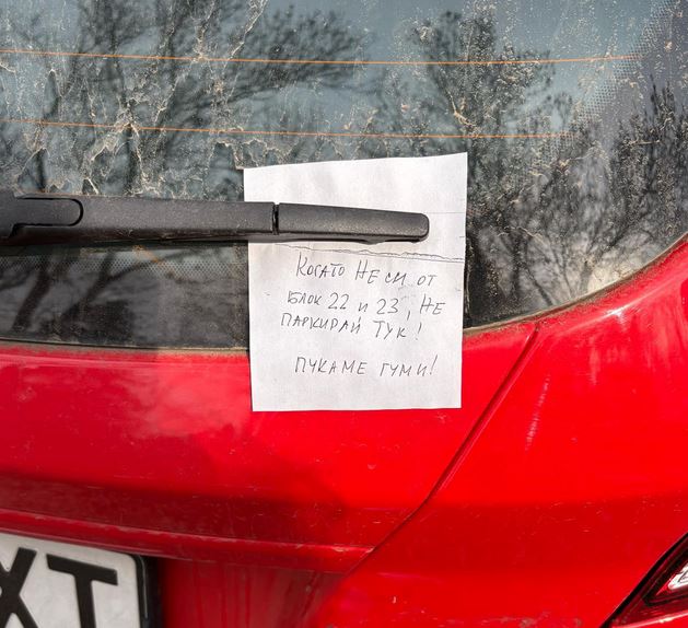 " Когато не си от блок 22 и 23, не паркирай тук. Пукаме гуми ", гласи гневното обръщение, което е сложено на задната чистачка на возилото. До него има и други паркирани коли, само че по тях листчета липсват.