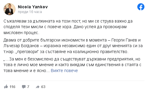 Съжалявам за дължината на този пост, само че ми се коства значимо да споделя тези мисли с повече хора. Дано съумея да предизвиквам умствен развой. Тава написа във фейсбука си предприемачът Никола Янков, който е създател и ръководещ съучастник на Expat Capital. Той проучва договарянията в мол " Парадайз " за нов кабинет, " нови политики и ново бъдеще " за България.