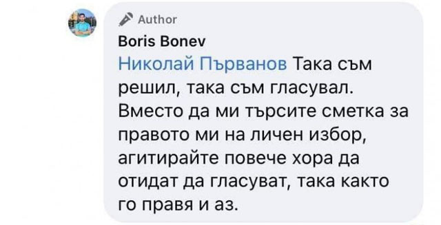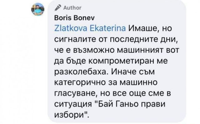 Съмнения в честността на вота са разколебали общинския консултант Борис Бонев да гласоподава с машина. В последна сметка той е избрал да упражни правото си на глас с обичайна хартиена бюлетина. „ Гласувах с готовност и решителност, по този начин както го върша, откогато станах на 18 години. Демократично общество и мощна страна не се градят с вървене за гъби, а с персонален ангажимент и изпитание! Направете това изпитание и гласувайте в този момент. … “, зове Бонев. Той оповестява, че организацията му „ Спаси София “ ще следи за честността на вота из страната, а той персонално щял да върви в столичния ромски кв. „ Факултета “. На фотосите на Бонев обаче негови почитатели видяха, че общинският консултант гласоподава с хартиена бюлетина, вместо с машина както желаят те. С решението си по какъв начин да гласоподава, той си навлече гнева на някои от по-крайните последователи на машините. Симпатизантите на Демократична България да вземем за пример с месеци бяха пропагандирани да гласоподават единствено машинно, макар че най-после Христо Иванов не съблюдава личните си заръки. „ …сигналите от последните дни, че е допустимо машинният избор да бъде злепоставен, ме разколебаха. Иначе съм изрично за машинно гласоподаване, само че към момента сме в обстановка „ Бай Ганьо прави избори “, изяснява Бонев на атакуващите го.