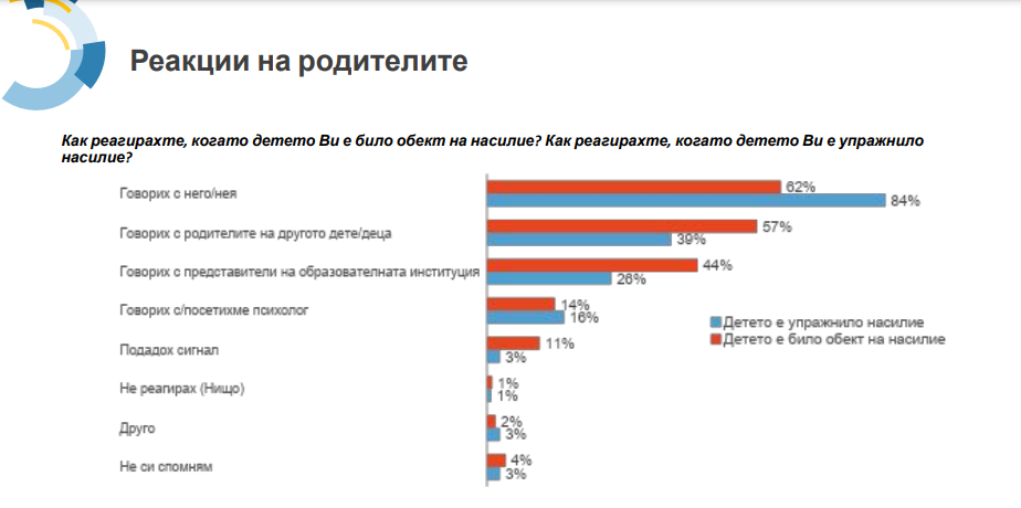 Само 1 от 10 родители подава сигнал, когато детето му стане жертва на принуждение. А в случай че самото дете прояви експанзия – този % пада до едва 3%. Най-честата реакция е безмълвие. В над една трета от случаите даже не се води диалог с потърпевшото дете. Това сочат данните от национално-представително