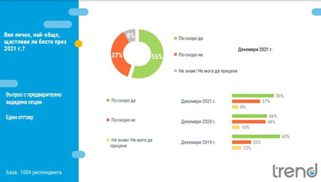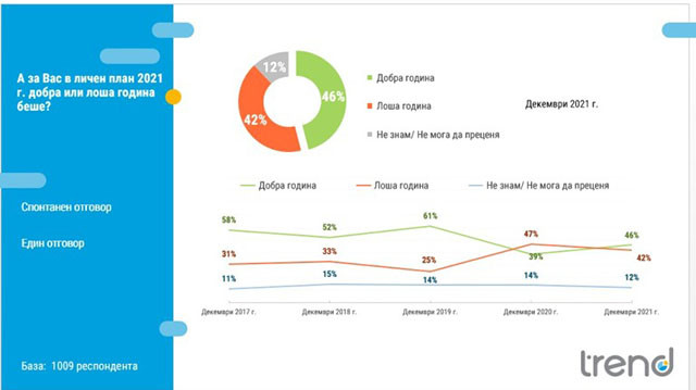 Само 14% от българите правят оценка отминаващата 2021 година за добра за България. Близо половината гледат по-скоро с оптимизъм към идната, демонстрира изследване на " Тренд ".