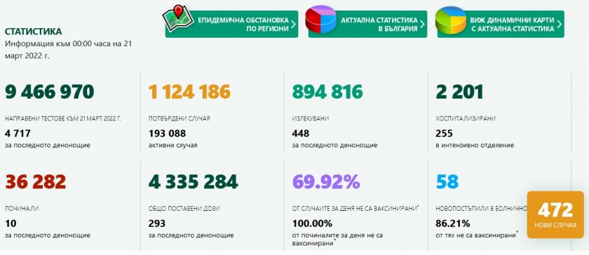 Само 472-ма са новодиагностицираните с COVID-19 лица у нас за миналите 24 часа съгласно типичната уикенд статистика в Националната осведомителна система. За последното денонощие са направени общо 4717 теста (826 PCR/3891 антигенни), а общо от началото на панедмията - 9 466 970.