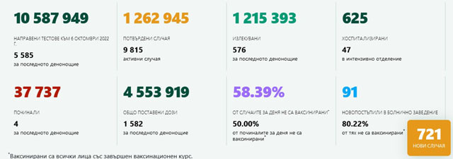 В сряда още 721 българи са се заразили с коронавирус, а дейните случаи са 9815, регистрира Единният информативен портал.