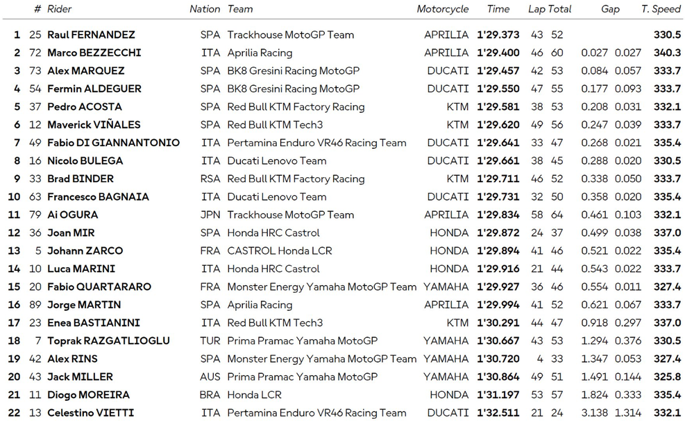 Най-доброто време в границите на днешния тестов ден даде Раул Фернандес от екипа на Тракхаус Априлия, който завъртя обиколка за 1:29.373. По този метод испанецът изпревари заводския водач на Априлия Марко Бедзеки с 0.027 секунди, а тройката с пасив от 0.084 оформи международният вицешампион Алекс Маркес, който през днешния ден имаше шанса да тества Дукати Desmosedici GP26.