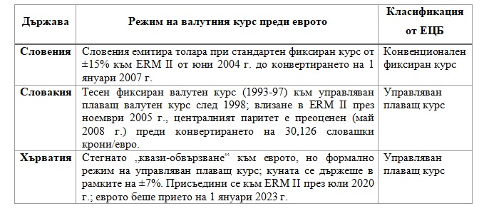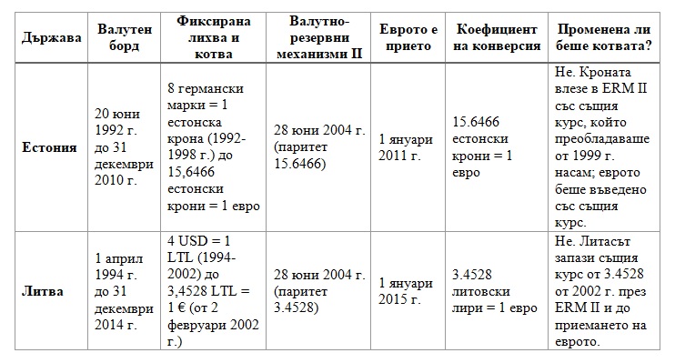 Само две страни от Източна Европа, включили се към еврозоната – Естония (2011 г.) и Литва (2015 г.), имаха правно обвързващи съглашения за валутен ръб. Нито една от страните не промени валутния си курс, откакто еврото послужи като валутна котва, демонстрира разбор на Фискалния съвет.