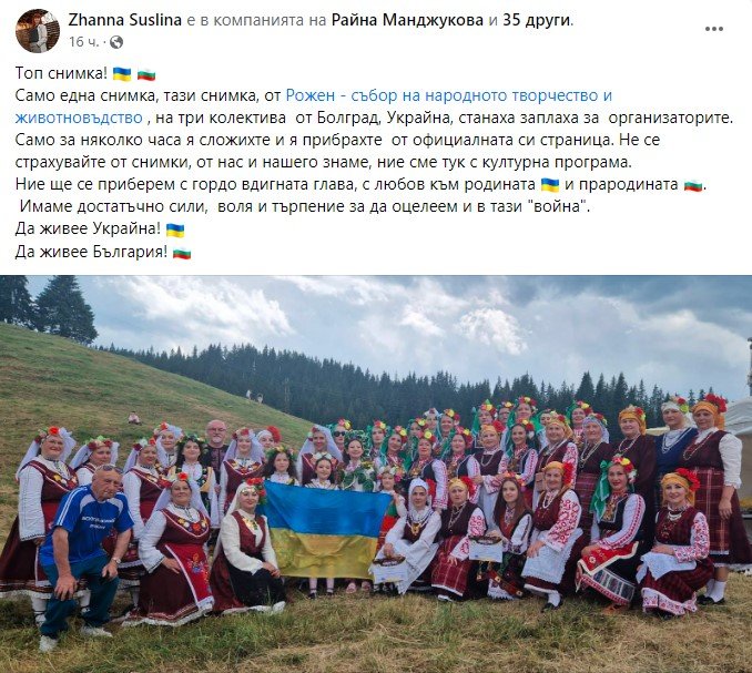 " Само една фотография, тази фотография, от Рожен - събор на националното творчество и отглеждане на животни, на три колектива от Болград, Украйна, стана заплаха за уредниците. Само за няколко часа я сложихте и я прибрахте от формалната си страница. Не се опасявайте от фотоси, от нас и нашето знаме, ние сме тук с културна стратегия ". Това написа в профила си във " Facebook " Zhanna Suslina.