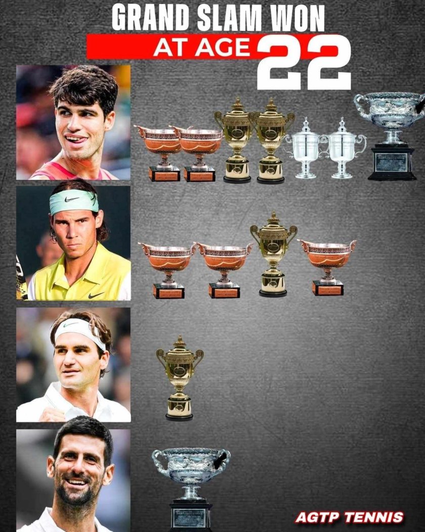 Само на 22 години Карлос Алкарас към този момент пренаписва историята на тениса. Младият испанец има на сметката си шест трофеи от шампионати от Големия шлем – достижение, което на същата възраст нито една от легендите Рафаел Надал, Роджър Федерер и Новак Джокович не е успявала да доближи.