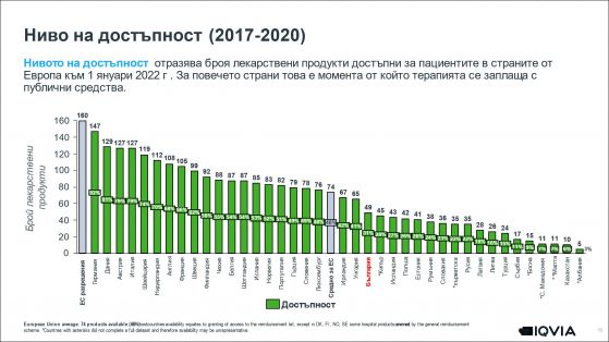 Само към 30% от позволените за приложимост лечения сред 2017-2020 година от Европейската организация медикаменти са налични за българските пациенти. Пациентите в някои страни от Европейския съюз (ЕС) чакат доста повече, с цел да получат достъп до нови лекарствени лечения, разликите се усилват, вместо да понижават.