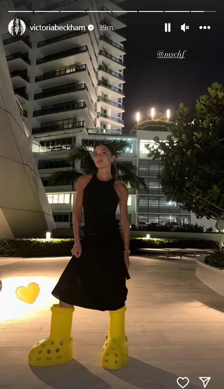 На фрагмента някогашната певица и сегашна дизайнерка е обута в жълти кроксове до коленете с цена от 450 $. Те са част от колаборацията MSCHFxCrocs.Не знаем кой би дал толкоз пари за тези странни жълти ботуши за топло време, само че откакто Виктория ги носи и популяризира, очевидно имат задоволително фенове.