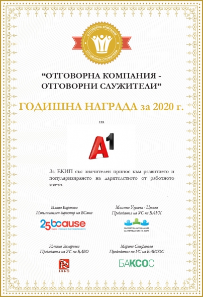 Само седмица откакто А1 разгласи, че удвоява събраната през 2020-а от дарения по ведомост сума от 40 000 лв., телекомът получи златен Годишен знак „ Отговорна компания – виновни чиновници “. В сходство с противоепидемичните ограничения, премията бе оповестена на онлайн гала. Съорганизиратори на самодейността са Фондация BCause, Българското сдружение за връзки с обществеността (БДВО), Българската асоциация за ръководство на хора (БАУХ) и Българската асоциация на КСО експертите (БАКСОС).