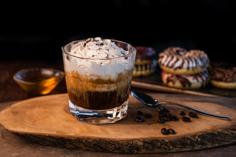 Разклатете и прецедете, гарнирайте с кафе на зърна.