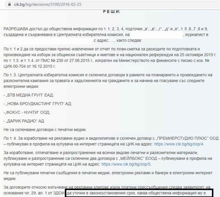 През първите две години от направената информация обаче са вписани единствено въпросите на заявителя и съответното решение по отношение на достъпа, не и наличието на информацията всъщност. От 2016 година до момента на уеб страницата на ЦИК се разгласяват в цялост решенията, както и информацията до заявителя всъщност. Дали това обаче не е нарушаване на Закона за достъп до социална информация?