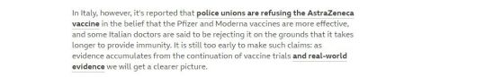 Още един образец - обява на Би Би Си от неделя, в която се оповестява, че полицейски синдикати в Италия отказват ваксината на AstraZeneca, тъй като са на мнение, че имунизациите на Pfizer и Moderna са по-ефективни.