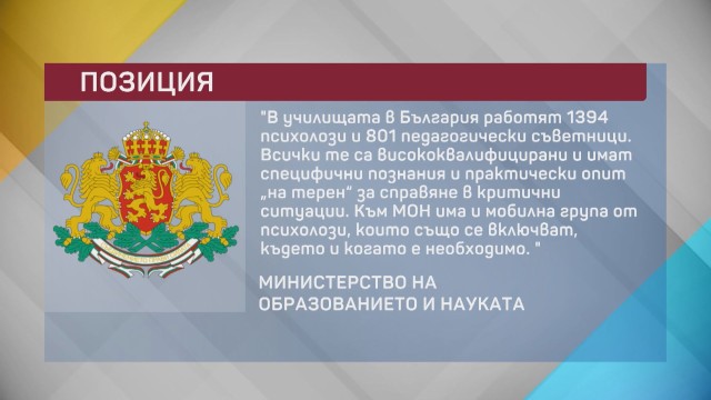 " В учебните заведения в България работят 1394 психолози и 801 педагогичен съветници. Всички те са висококвалифицирани и имат характерни знания и на практика опит " на терен " за справяне в сериозни обстановки. Към МОН има и мобилна група от психолози, които също се включват където и когато е належащо. “