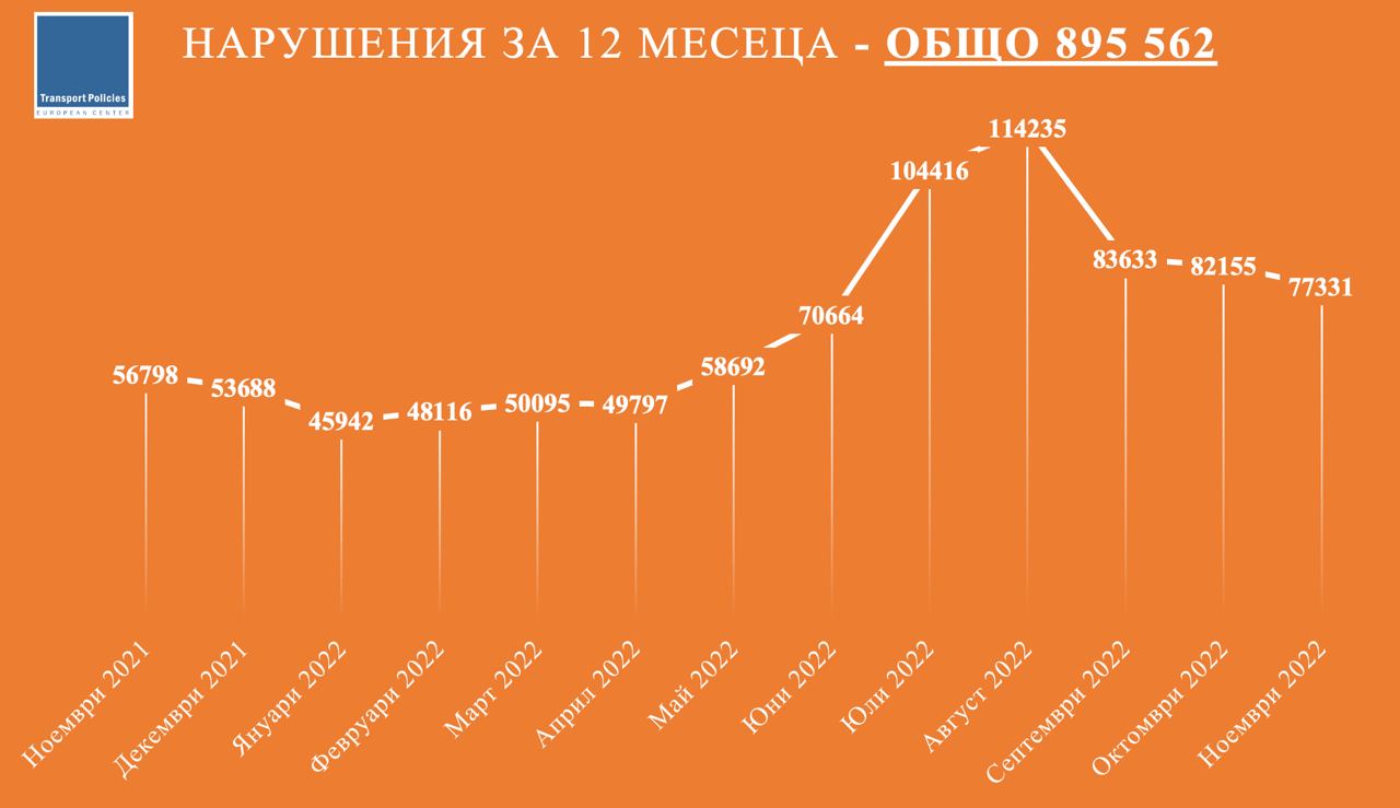 Само за 12 календарни месеца ТОЛ ръководството е разпознало 895 562 нарушавания за потребление на републиканската пътна мрежа (РПМ), без да е заплатена дължимата такса за коли (с българска и задгранична регистрация). Данните са от АПИ в отговор на питане, отправено от Европейския център за транспортни политики по Закона за достъп до социална информация. Прави усещане, че в случай че пред ноември 2021 година нарушаванията са били 56 798, то за същия месец на 2022-а те са 77 331, без да е ясно на какво се дължи това нарастване с над 20 000 броя. Притеснително е също, че в случай че от ноември 2021 година до май 2022 година нарушаванията приблизително месечно са били към 50 000, то след месец юни те скачат до над 80 000 бр. приблизително месечно. Стойността на осъществените нарушавания възлиза на 62 689 340 лв. и то, в случай че приемем, че за всички тези нарушавания ще се заплати единствено обезщетителната такса в размер на 70 лева Припомняме, че приблизително за една година приходите от винетки са към 400 милиона лв..
