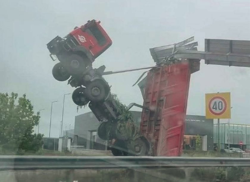 Самосвал се подвигна във въздуха на автомагистрала „ Тракия “ след удар в табела над пътя. Инцидентът е станал на отбивката за Пловдив в посока София.
