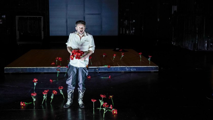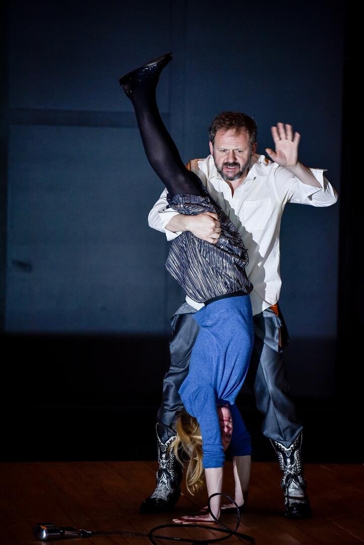 Докато показва този монолог, на сцената Финци застава на ръце, удря си плесници, раздира сакото и ризата си и даже събаря декора на сцената зад тила си.
