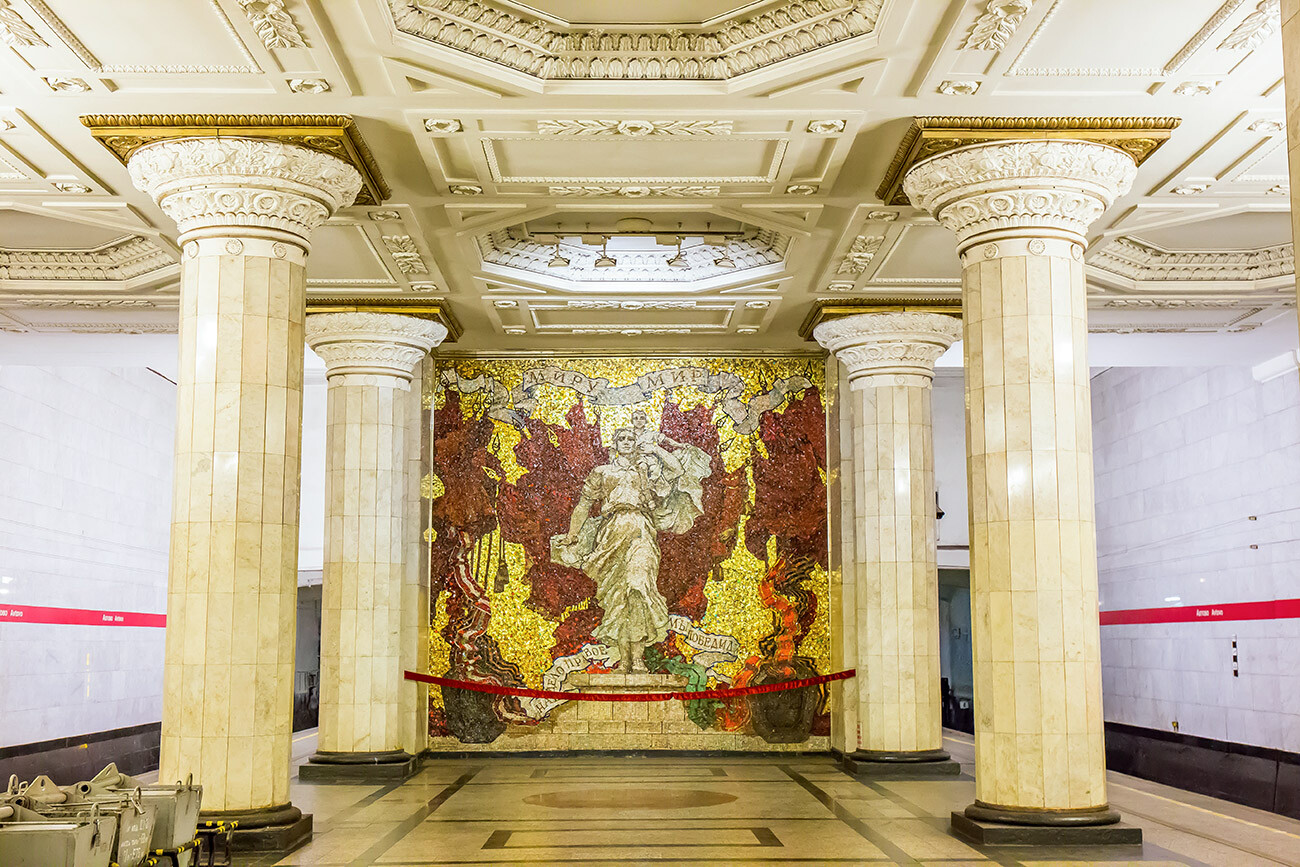 Темата на оформлението е защитата на Ленинград по време на Великата отечествена война. Станцията е украсена с голямото мозаечно пано „ Победа “, а по полилеите и лампите има мечове, лаврови венци и други триумфални знаци.