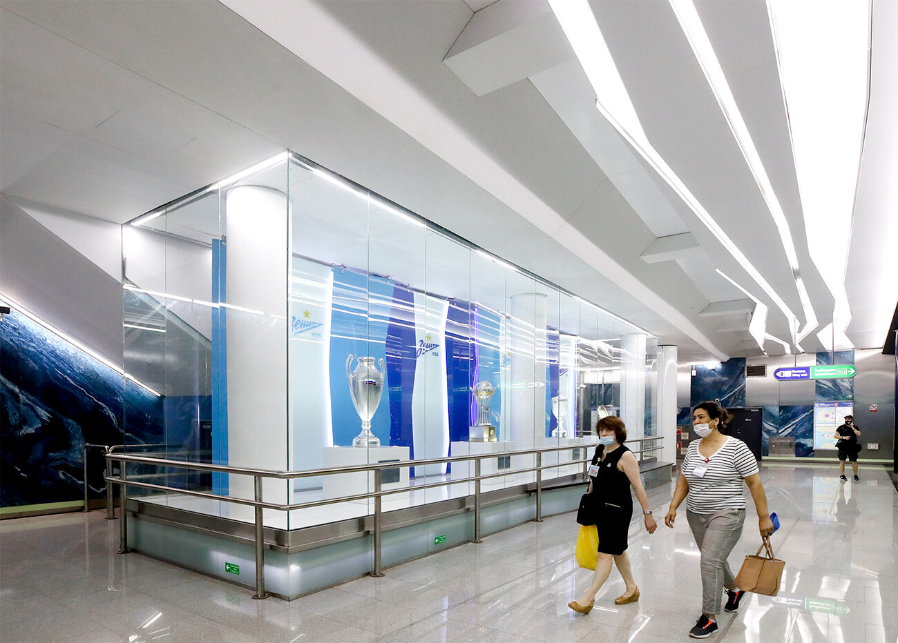 Във вестибюла на станцията са изложени футболните купи на „ Зенит “. Тук е и купата от шампионата на Съюз на съветските социалистически републики през 1984 година, и трофеите от шампионатите на Русия през 2007, 2010, 2011 и 2015 година.