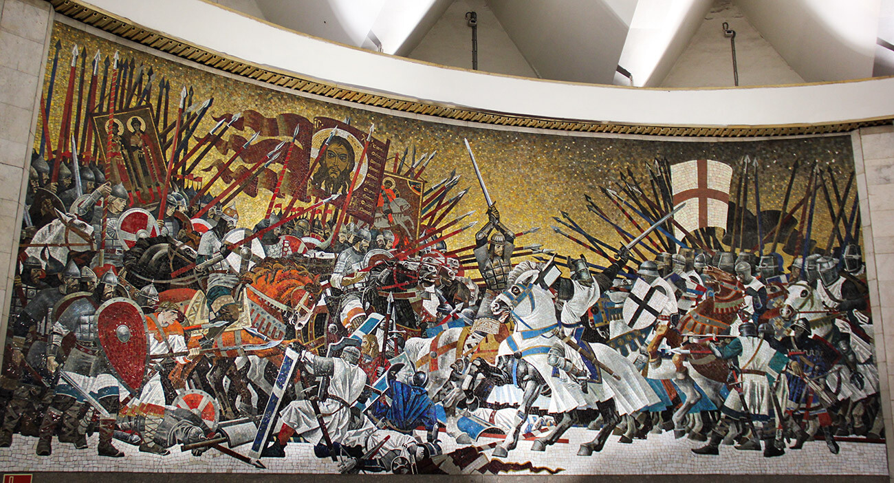 Горния вестибюл на станцията е декориран с голяма мозайка – „ Битка на леда “. Самият Александър Невски е в центъра на мозайката с вдигнат меч, подготвен да посече рицаря-кръстоносец.
