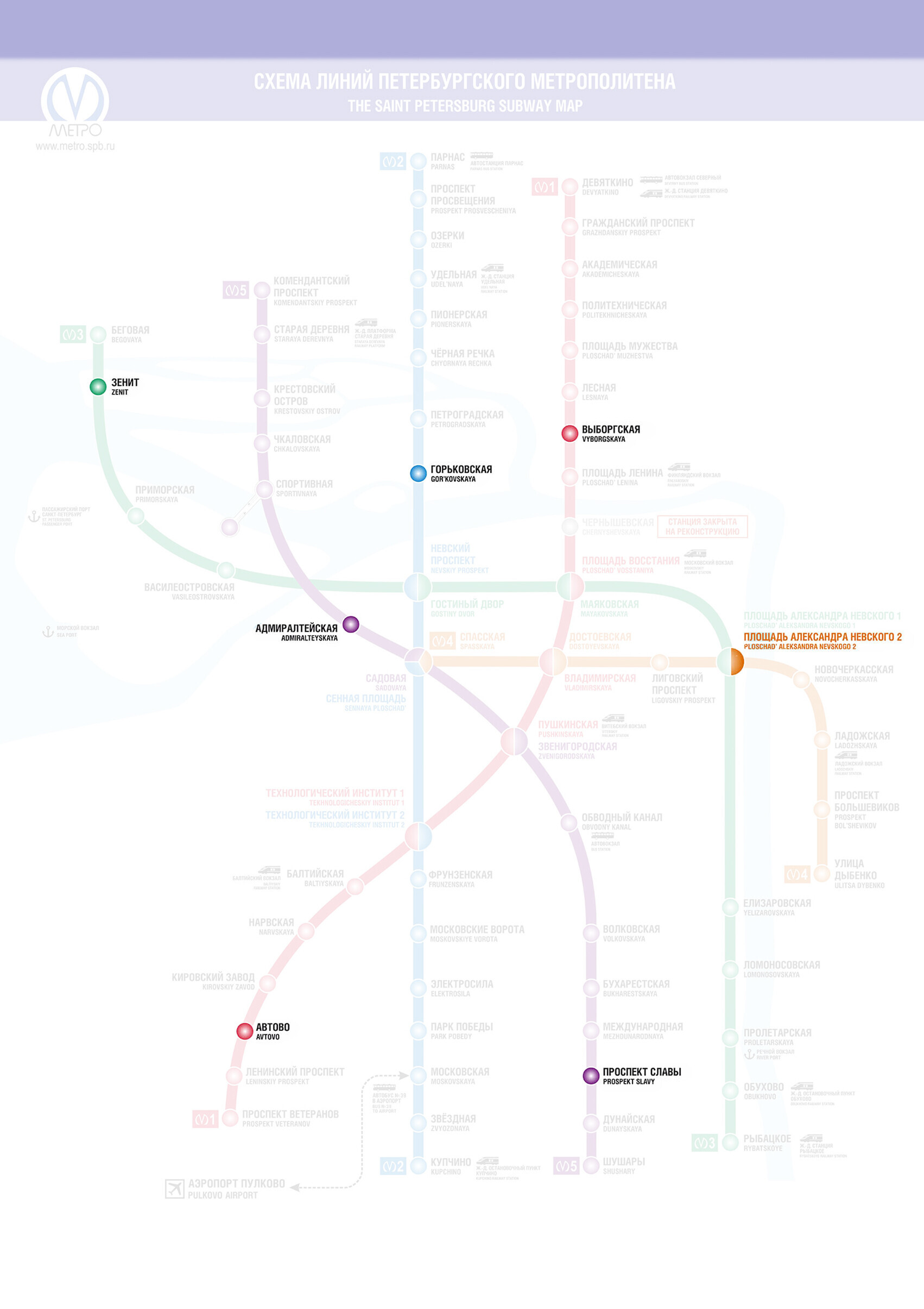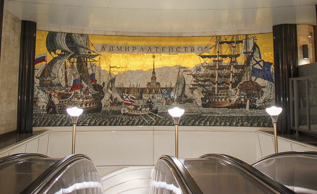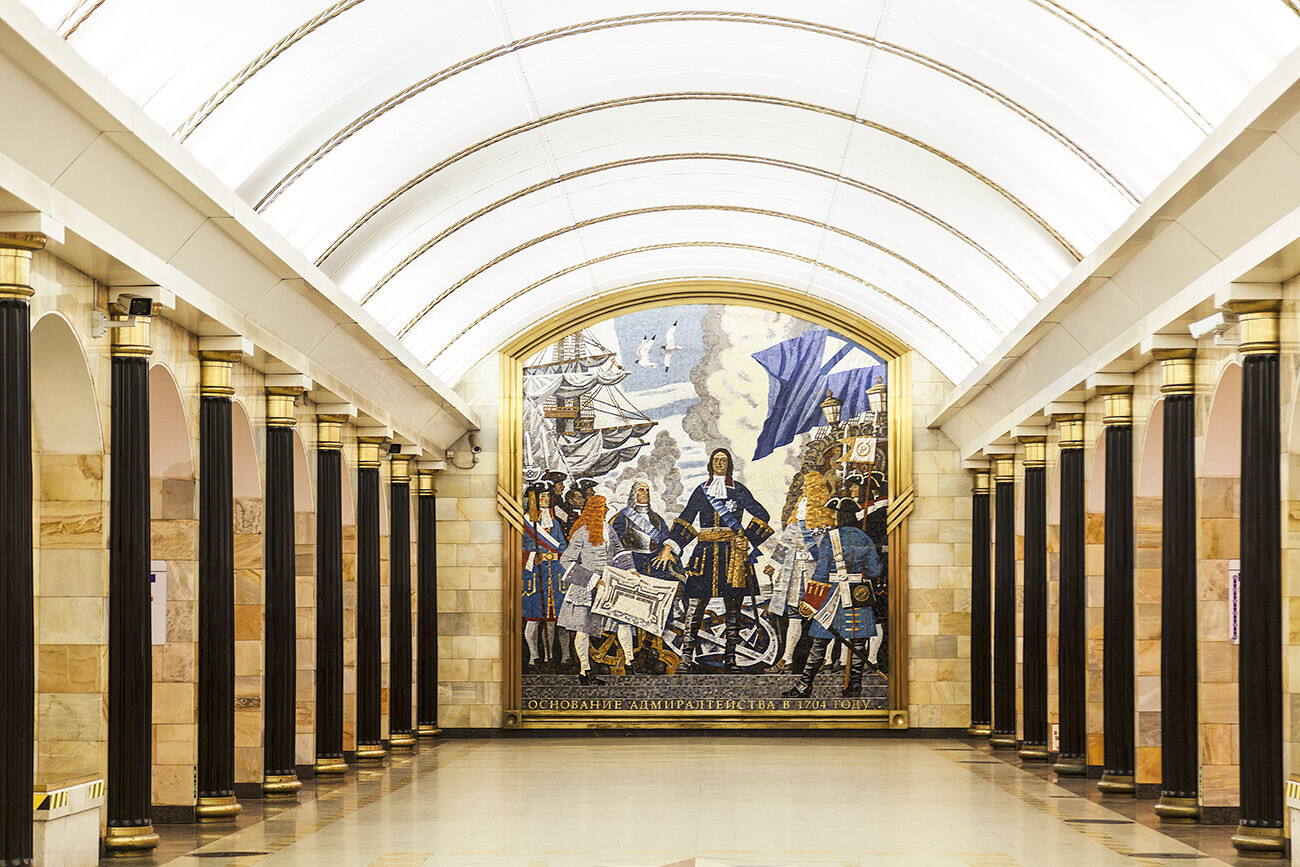 Къде да отидете наоколо?Манастирът „ Александър Невски “ – разгледате некрополите на писателя Денис Фонвизин, на учения Михаил Ломоносов, на реформатора Сергей Вите и на други популярни хора.Крепостната стена в центъра на града – разходете се край крепостната стена, която в действителност е част от храма „ Фьоодоровска икона на Божията майка “.Невски проспект – минете през целия Невски проспект, който свършва на площад „ Александър Невски “.6. „ Адмиралтейская “: станция-призрак