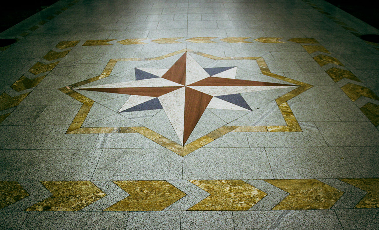 Навсякъде е употребен бял мрамор, който се съчетава красиво с яркочервените звезди по витражите.