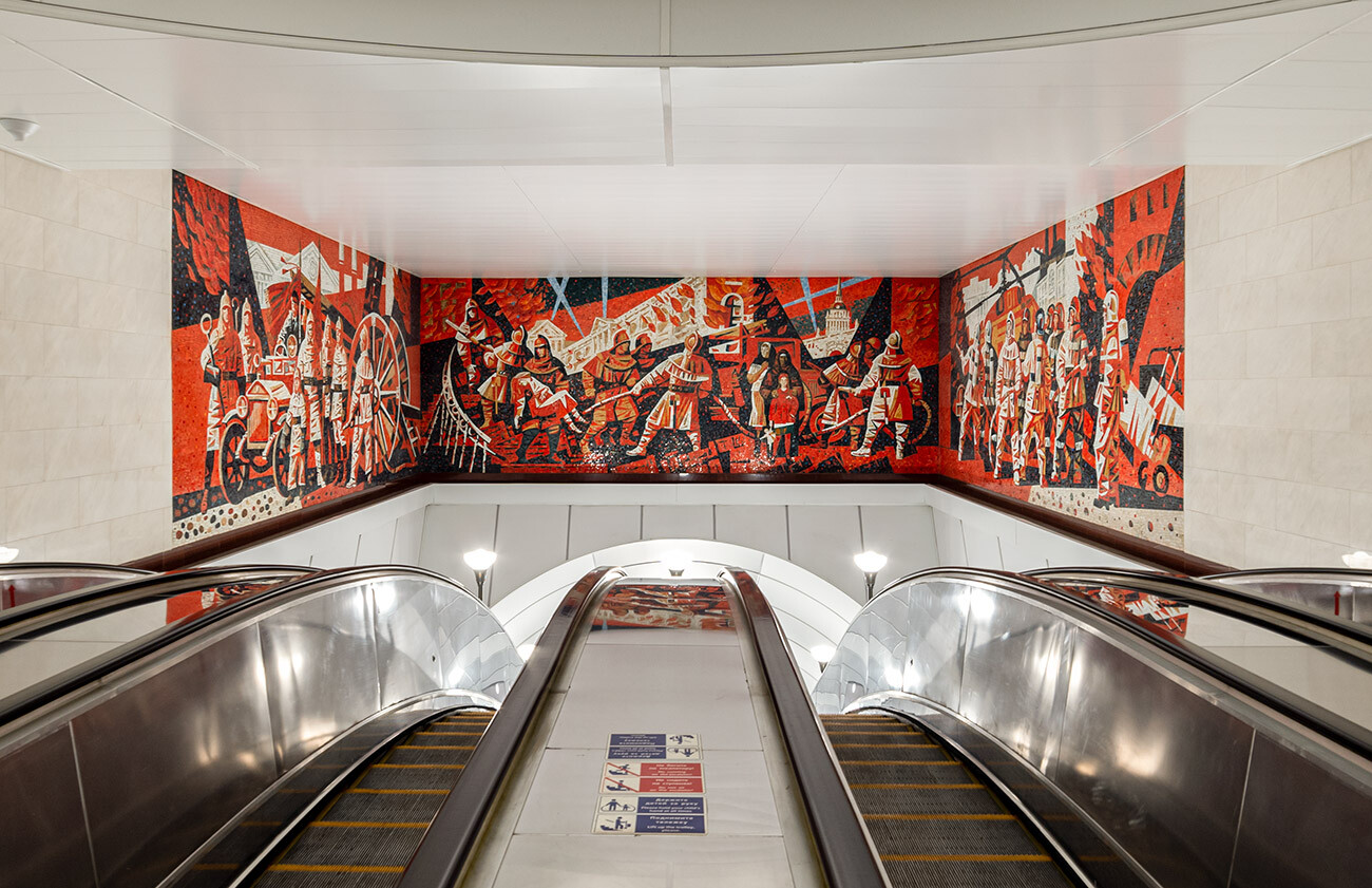 Но най-интересното тук ви чака от горната страна. Южният вестибюл на станцията е отдаден на героите пожарникари. Сводът е декориран с голяма мозайка, а в прехода са изложени пожарни коли: от първата отпреди революцията до модерна техника.