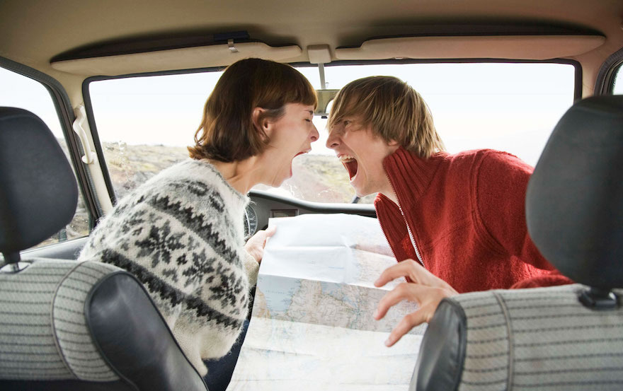Съпруг, който се заема да учи жена си да кара, прави първата стъпка към развода. Навсякъде по света мъжете дават едни и същи указания на дамите си: „ Завий наляво!… Намали!… Смени скоростите… Внимавай за пешеходците… Съсредоточи се!… Спри да плачеш! “ За мъжа шофирането е тест за способността му да се ориентира пространствено по отношение на околната среда. За дамата задачата на шофирането е да стигне гладко от точка А до точка В. Ако е в колата като пасажер, най-успешната тактика, която мъжът може да употребява, е да затвори очи, да пусне радиото и да спре със забележките и мненията, тъй като е потвърдено, че като цяло дамите са по-безопасни водачи от мъжете. Повече от несъмнено е, че тя ще го откара цялостен и незасегнат там, накъдето са тръгнали — единствено дето това ще й отнеме малко повечко време. Но пък огромното преимущество да пътуваш с жена водач е, че в това време можеш да се отпуснеш и че ще стигнеш жив.