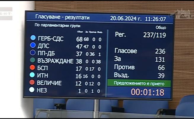 Тя получи поддръжка от ГЕРБ-СДС, Движение за права и свободи и Има Такъв Народ. Против се оповестиха депутатите от ПП-ДБ и " Величие ", а представителите на " Възраждане " се въздържаха.