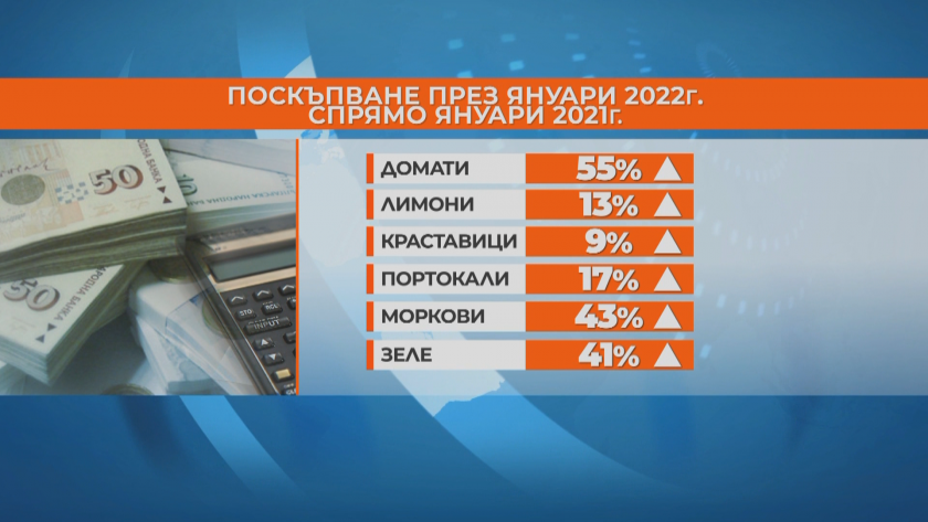 На годишна база повишаване има и при плодовете и зеленчуците. Рекорд държат морковите - с 43% и зелето - с 41%.