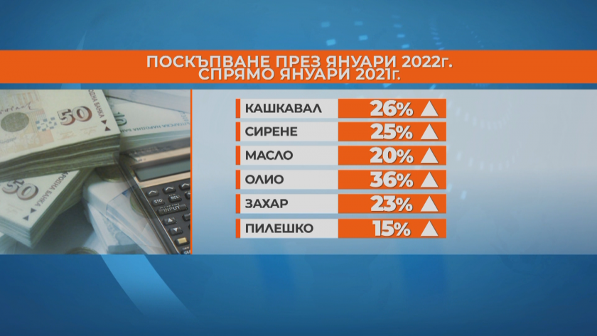 Със 17,1% са поскъпнали 27 съществени храни от потребителската кошница през януари тази година в съпоставяне със същия интервал на предходната, оповестяват от Комисията по стоковите тържища и борсите. Експертите следят съществени храни като захар, брашно, олио, масло млечни и месни артикули. Инфлацията при храните сега надвишава тази при останалите артикули и услуги, а прогнозите са покачването в цените да продължи.